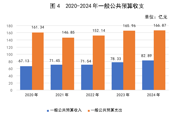 全年完成一般公共預算收入82.89億元,比上年增長5.8%,其中,稅收收入46.42億元,增長4.0%。一般公共預算支出166.87億元,增長0.5%。
